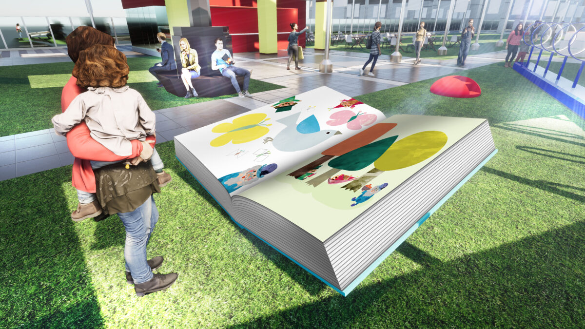 JR大阪駅・大阪ステーションシティ5階 時空(とき)の広場を“物語と出会う芝生の公園”と位置付け、絵本作家やアーティストによる多彩なアート作品や遊具を設置し、世代を問わず楽しめる空間を創出します。さらに、人気絵本作家たちもとみちこさんのオリジナルスタンプラリーや親子で楽しめるアートワークショップイベントの実施、カフェ「バール・デルソーレ」でのコラボドリンクの展開等も予定しています。
