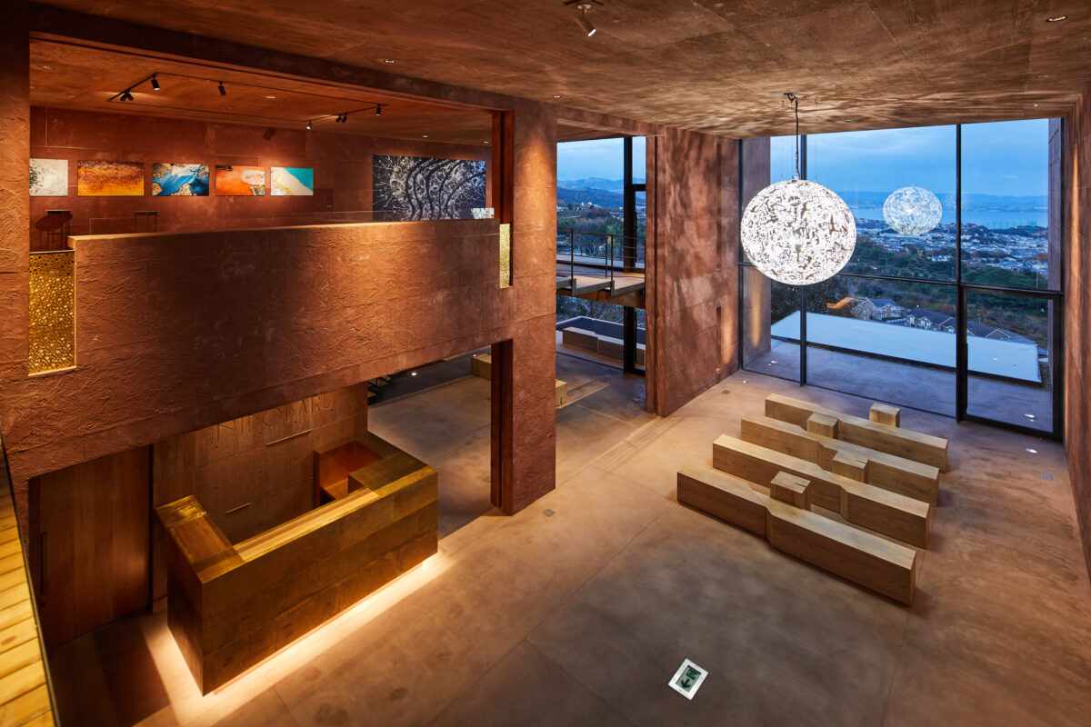 当館は市街地を見下ろす高台に位置し、夕暮れから夜にかけて刻一刻と表情を変える景色が広がります。やがて日が落ちると、街の灯りがきらめき始め、湯けむりがやわらかく立ちのぼる、別府ならではの幻想的な夜景が眼前に広がります。静寂と躍動が交差するその風景の中で奏でられる音楽は、まるで景色と呼応するかのように空間へ溶け込み、訪れる方の感性にやさしく寄り添います。