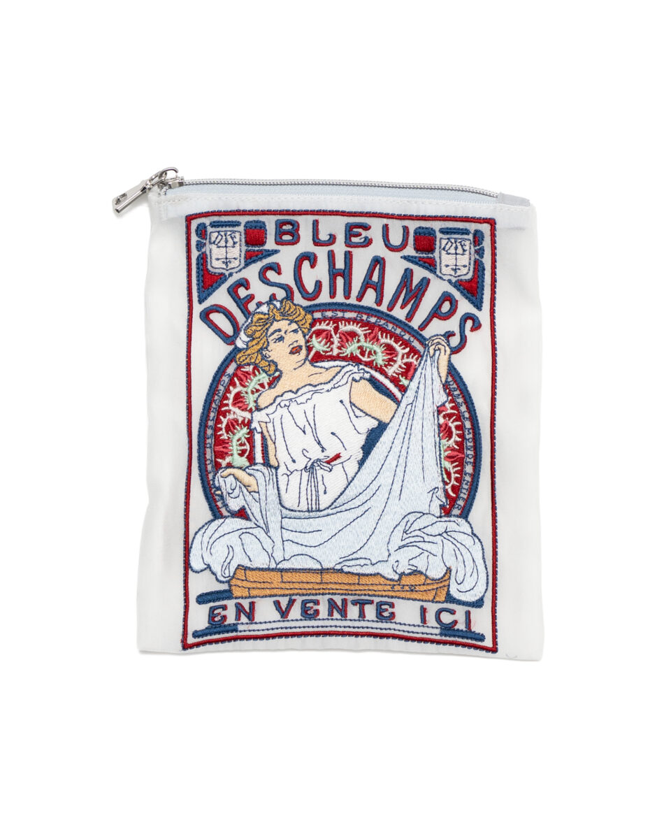ミュシャが手掛けた洗濯洗剤の広告「ブル・デシャンプ」からインスパイアを受けたポーチ。