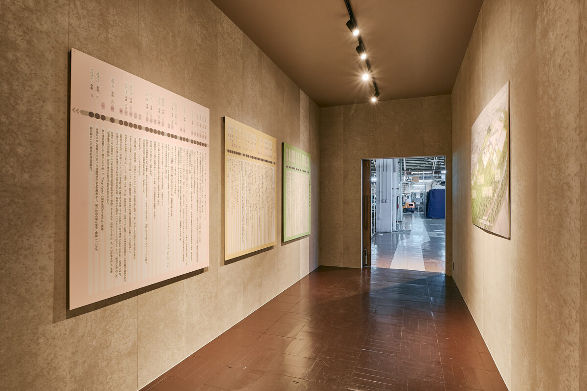 丹後ちりめんの歴史を学べる年表コーナーと、次の300年に向けた構想の紹介パネル