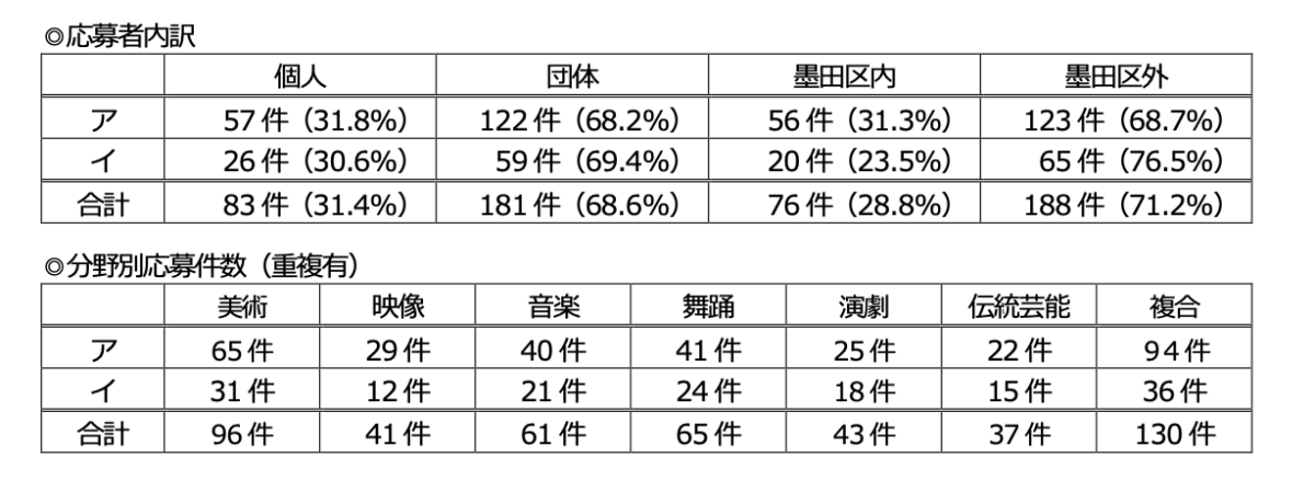 応募件数は、従来のすみゆめに比して約6倍となり、区外の東京23区はもとより、沖縄、福岡、鳥取、大阪、神戸、千葉、埼玉など都外の応募が25%を占めました。美術、音楽、演劇、舞踊、パフォーマンスなど分野も幅広く、さらに分野を特定できない複合的なもの、すみだの人や地域と共創するユニークなプロジェクトが多数寄せられました。