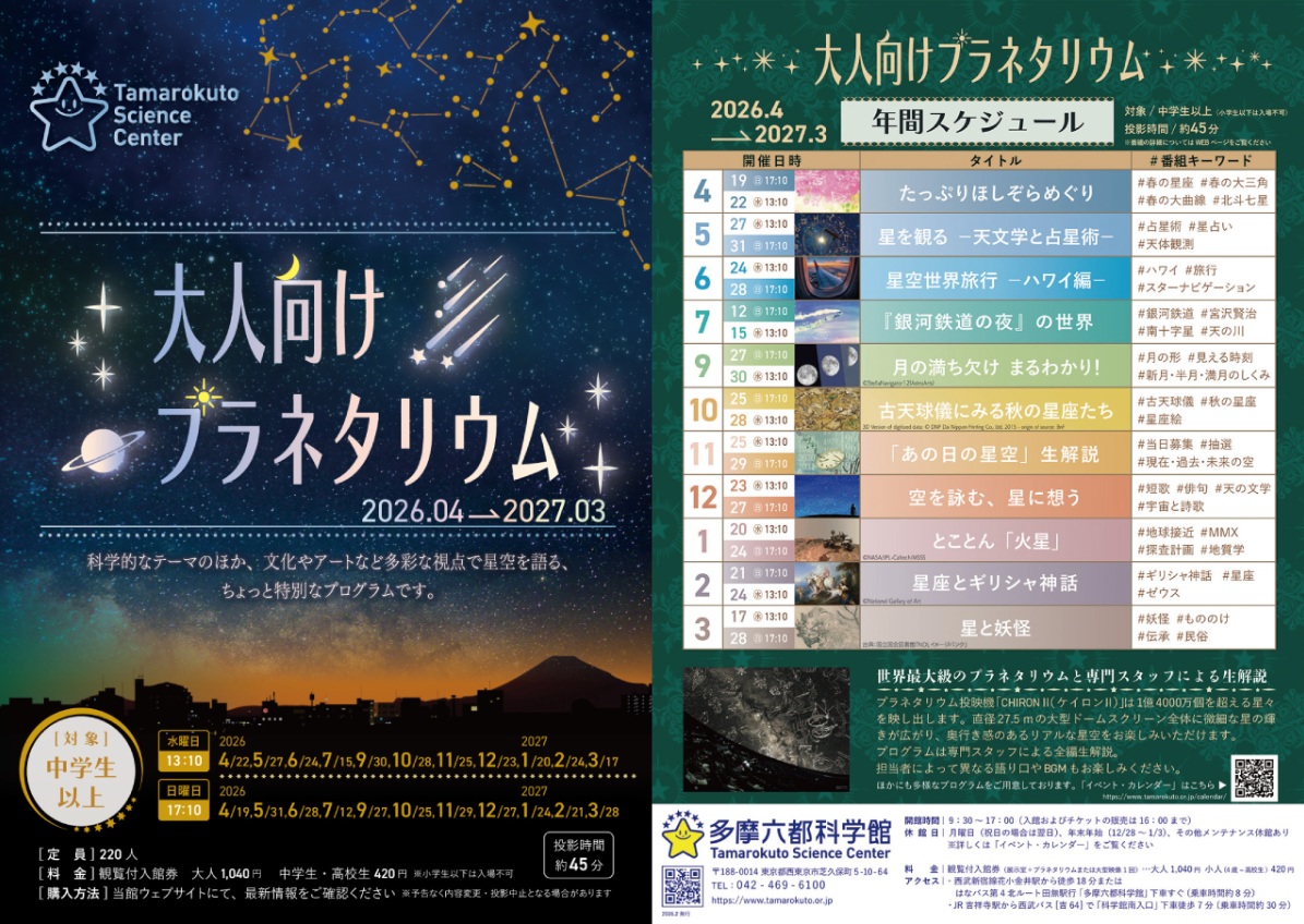 多摩六都科学館(東京都西東京市、館長:髙柳雄一。以下、当館)では中学生以上を対象とした「大人向けプラネタリウム」を投影しています。