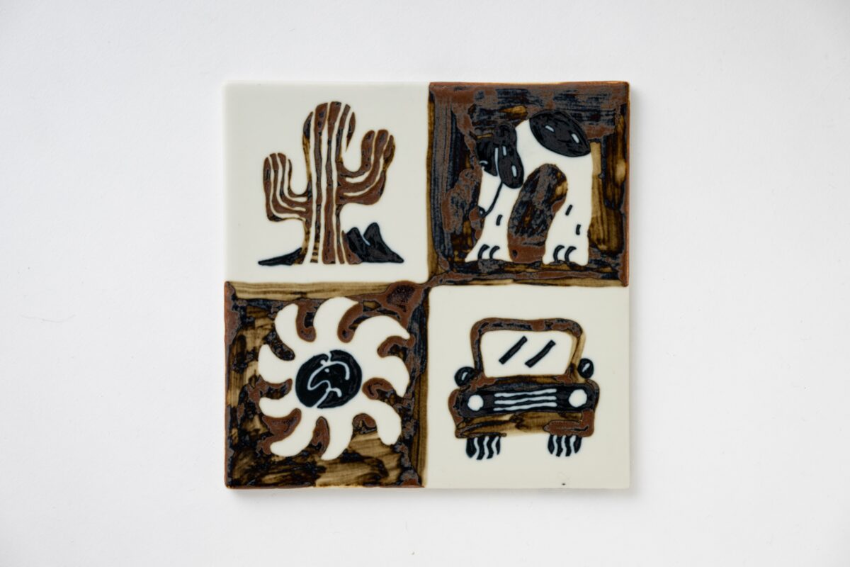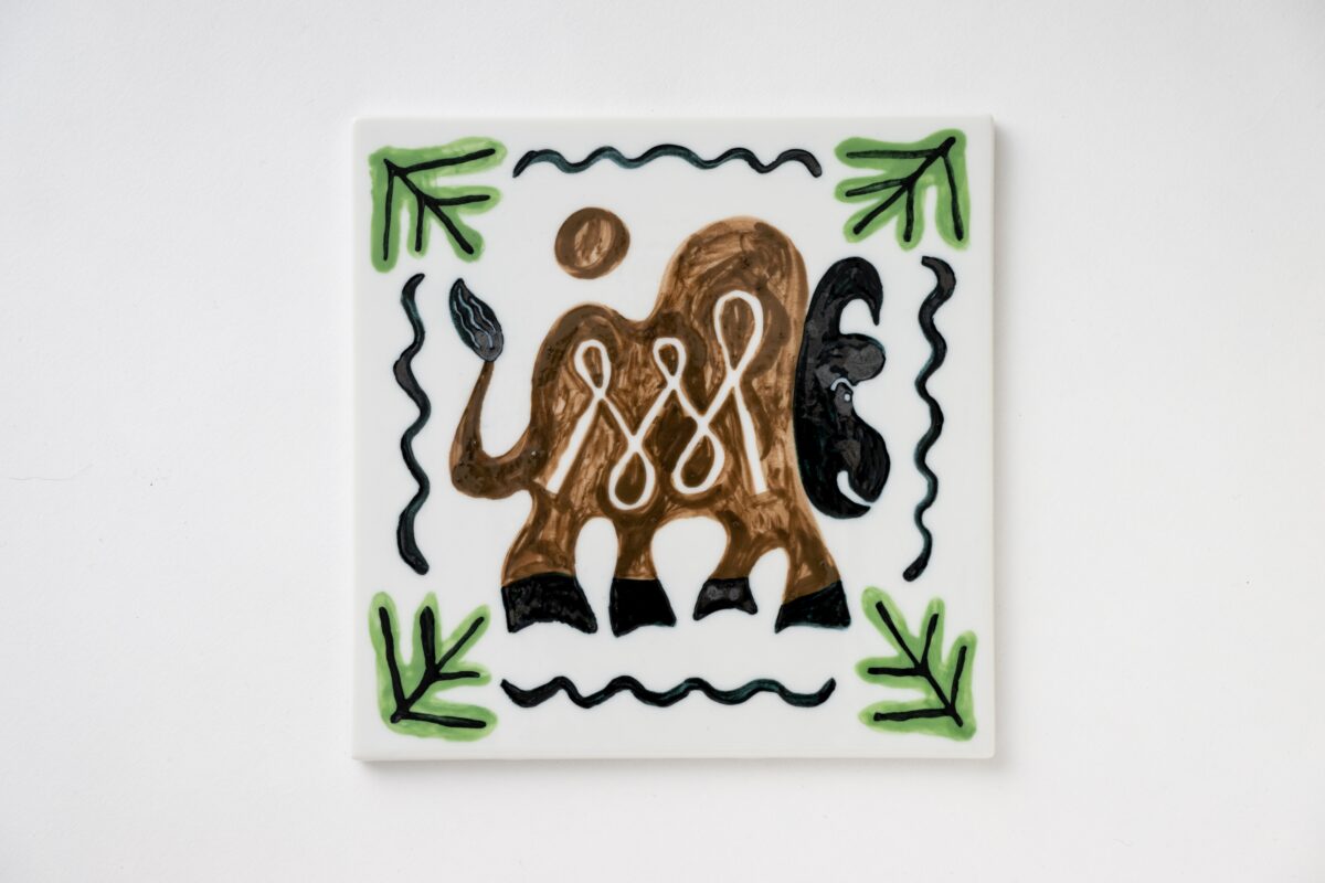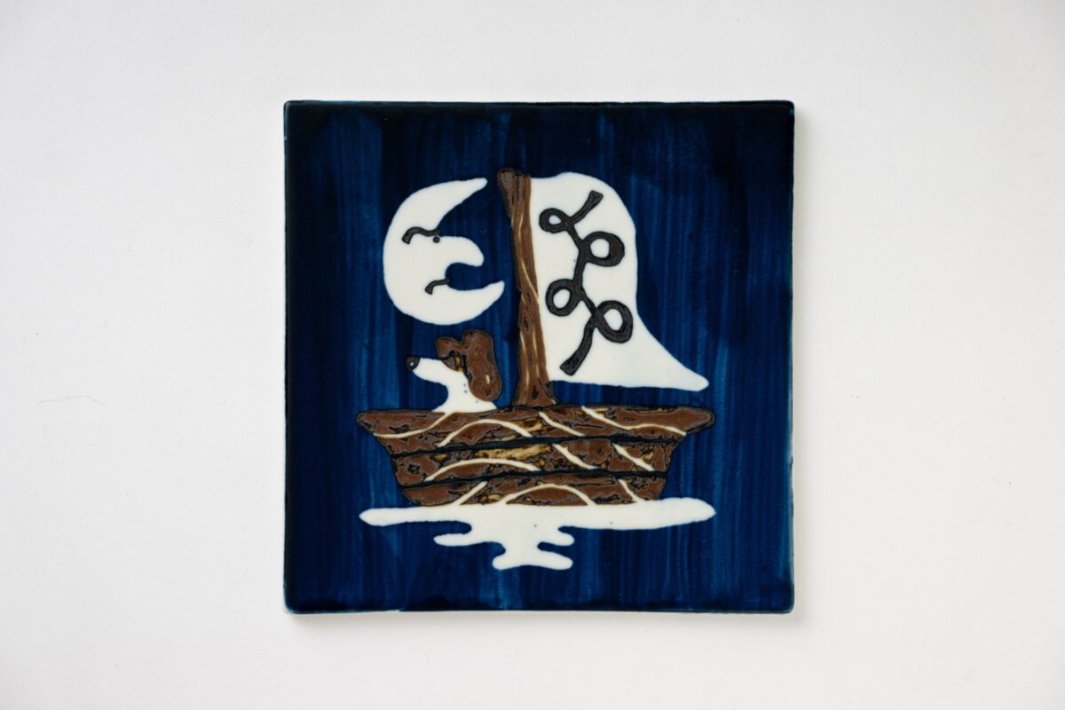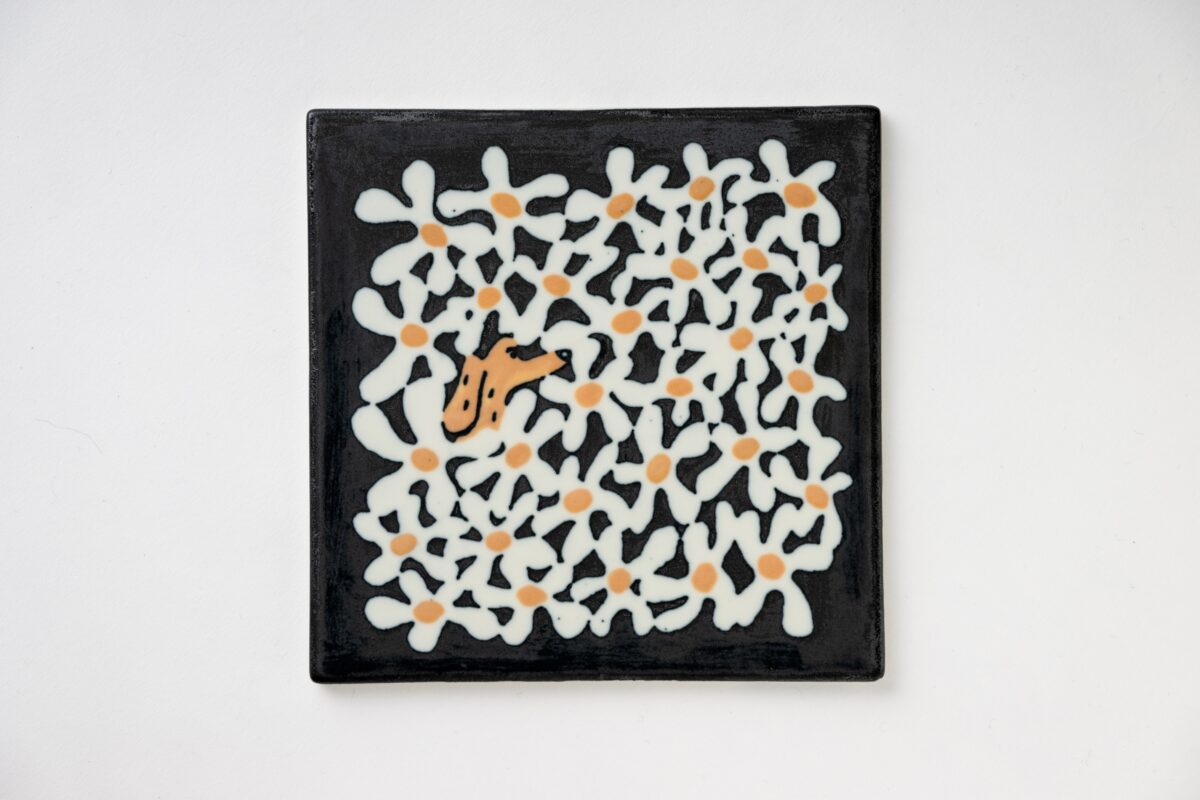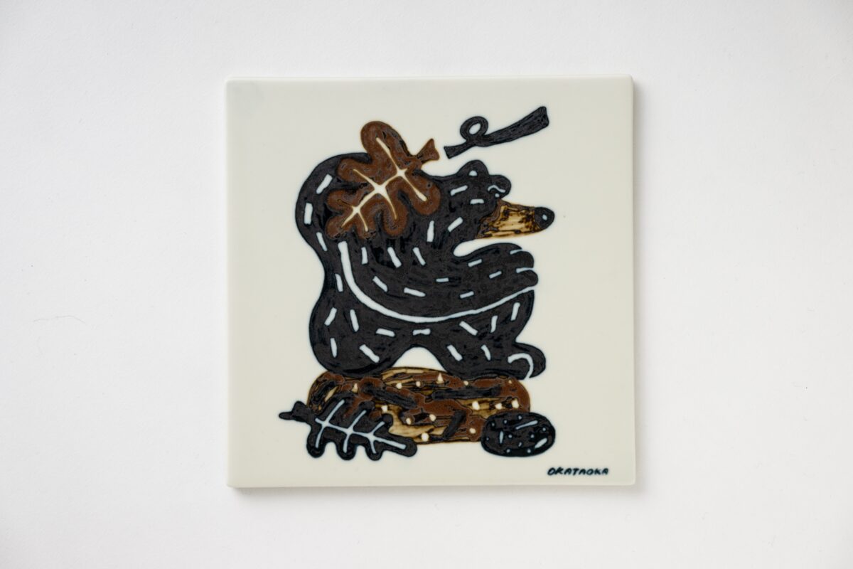 本展では、中外陶園との協働により、動物や自然をモチーフにしたドローイングを、自身初となる陶板作品として発表します。寒さの厳しい1月に行われた中外陶園の工房での制作体験が、作品に独特の“温度”をもたらしました。無意識に求められた“暖”の気配は、春や夏を思わせるモチーフとして現れ、陶板という形式のなかに、季節が移ろう手前の曖昧な時間をとどめています。