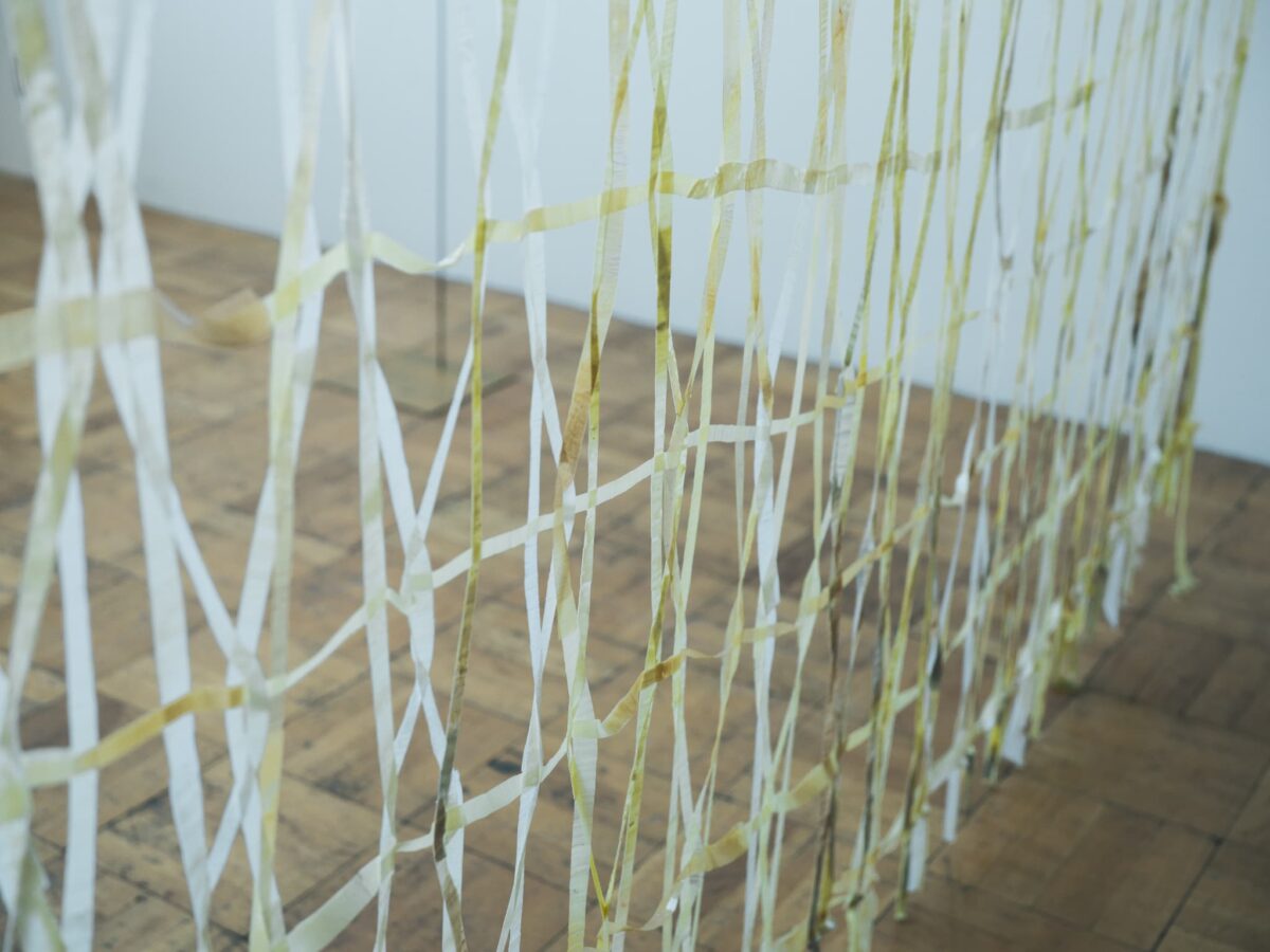 編み、組み直された絵は、壁面に固定されることなく、空間の中で成立する位置を与えられている。絵具は張力と密度の差を生み、像は自立も接地もしない。