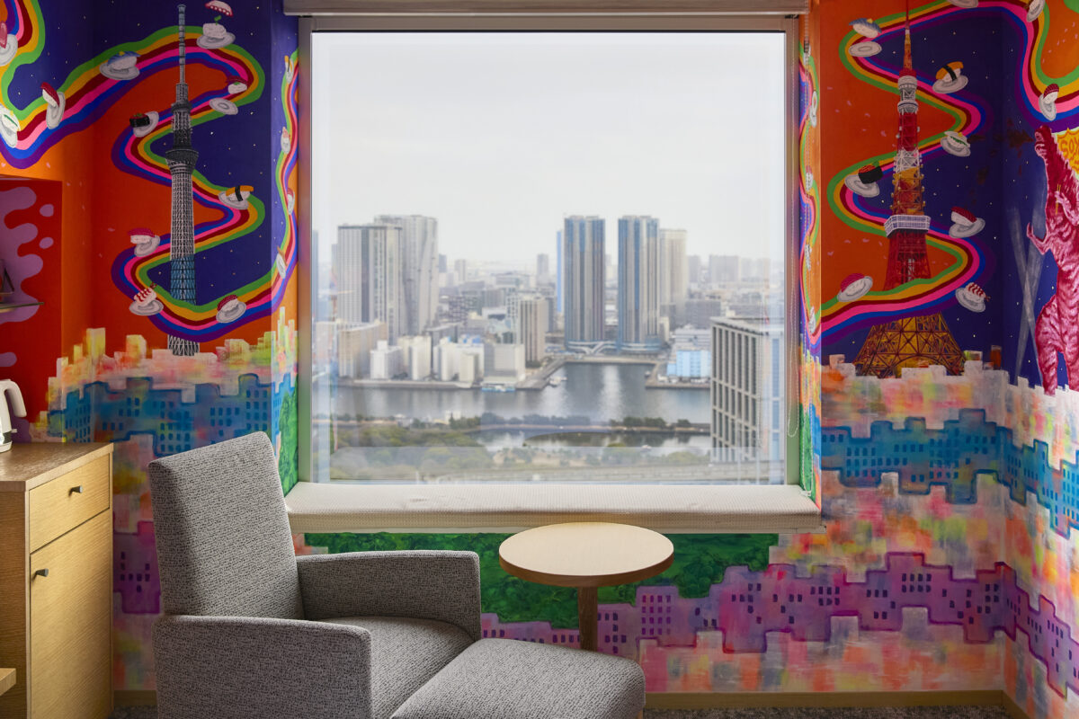 ベッドのヘッド側の壁に描かれているのは、握り寿司が誕生した1820年代の江戸。サイドの壁には、ロボットが宇宙人にお寿司をふるまう近未来の光景が広がります。ベッドのフット側の壁は、遥か昔、お寿司の神様が魔法でお寿司を生み出していた…かもしれない古代の世界、そして窓側の壁には、私たちが生きる現代が描かれています。醤油を吹くゴジラ、スカイツリー、東京タワー。その景色は、窓の外に広がる浜離宮へと自然につながり、室内と現実世界の境界を曖昧にしていきます。