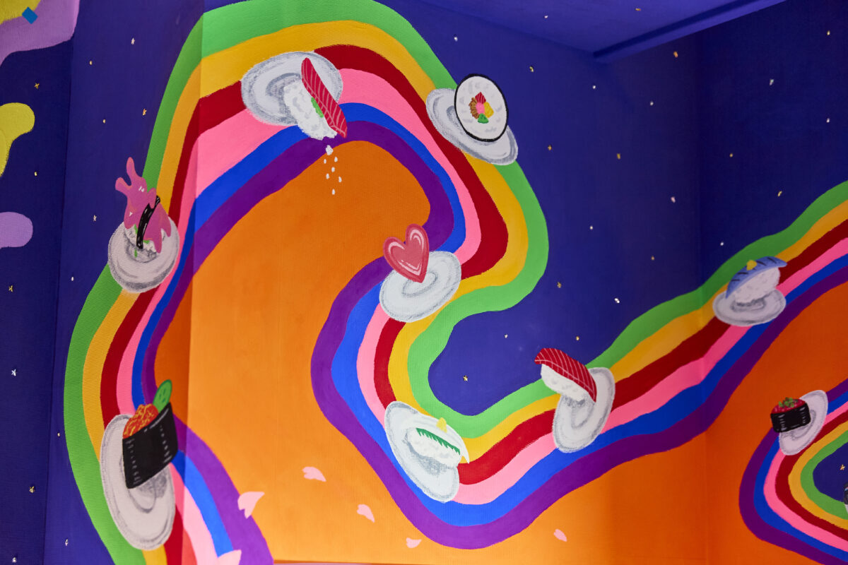 The rainbow that circles the entire room represents the kaiten-zushi lane.