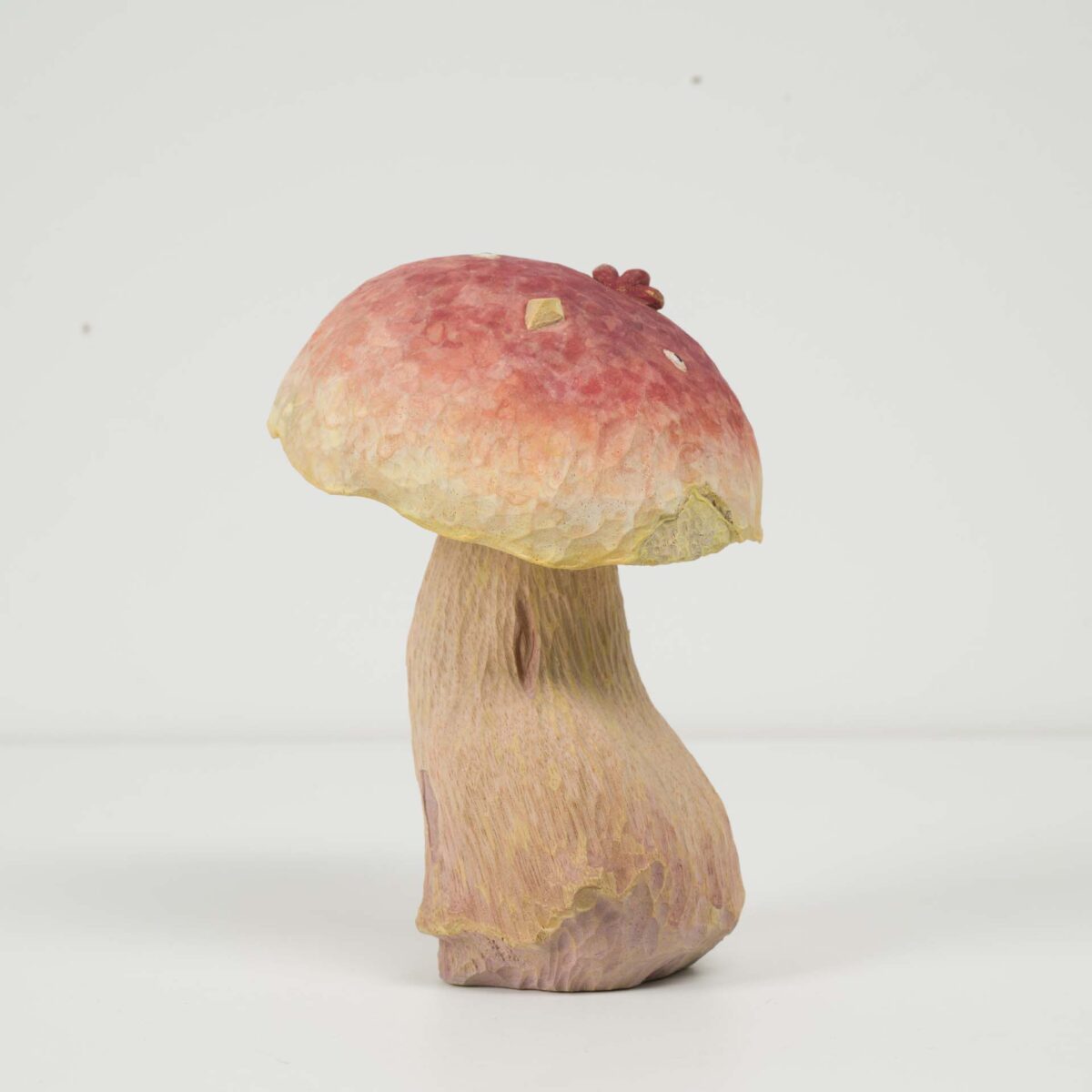 かか/1995年生まれ。女子美術大学大学院研究科美術専攻立体芸術修了。平安時代の木像技法「一木(いちぼく)造り」、檜や岩絵具といった伝統的な素材を使い、きのこや架空のキャラクターをモチーフにした木彫作品を制作。ポップな印象のなかに複雑な深みがある作風が特徴。