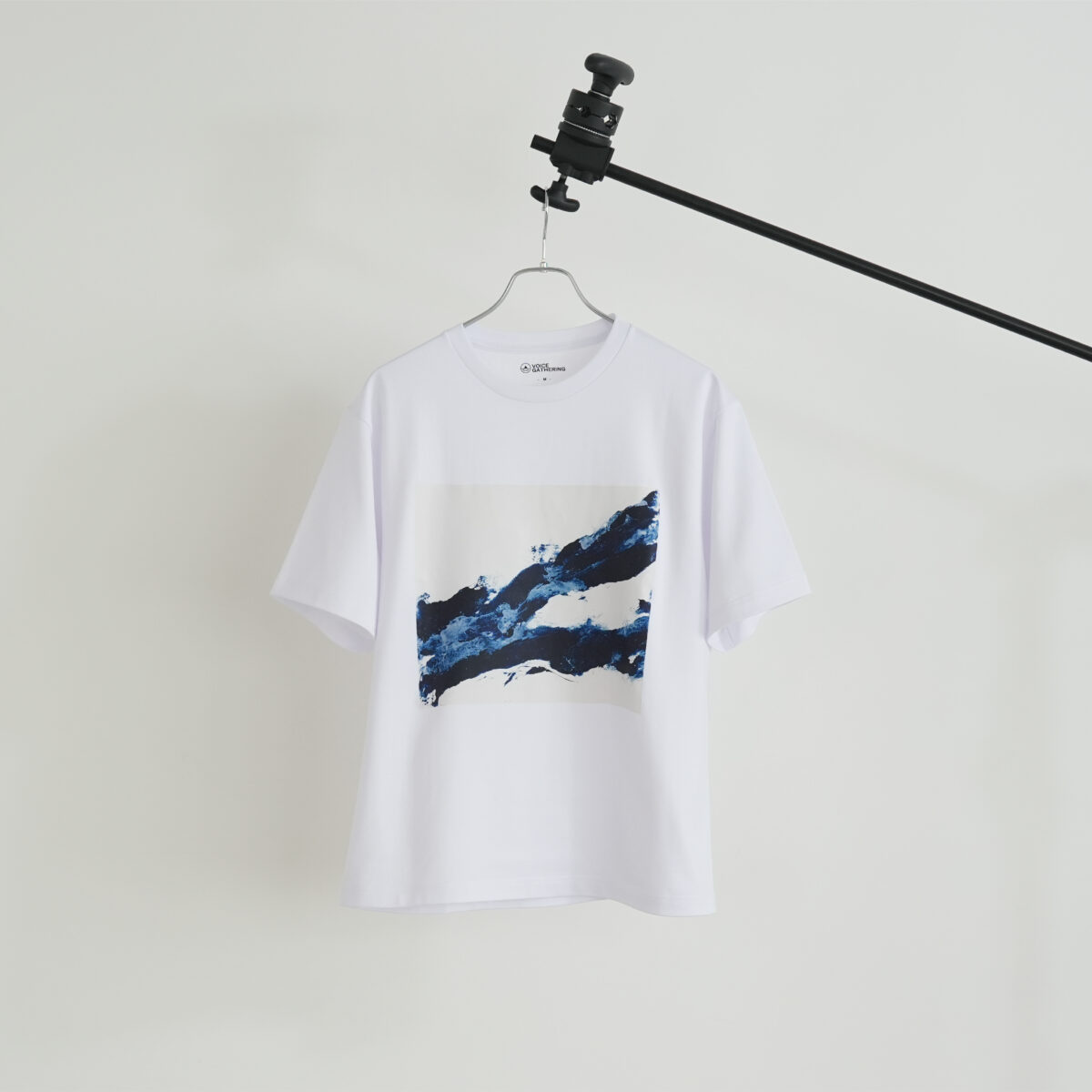 アートを際立たせる「白」にこだわりました。表面をポリエステル、裏面がコットンになるように編立ています。ポリエステルでクリアな白と白の持続性を、コットンで肌触りと吸湿性を出し、色と着心地を両立させています。