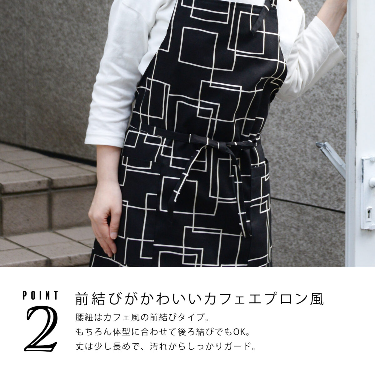 腰紐はカフェ風の前結びタイプ(後ろ結びでもOK)。丈は少し長めで、汚れからしっかりガードします。