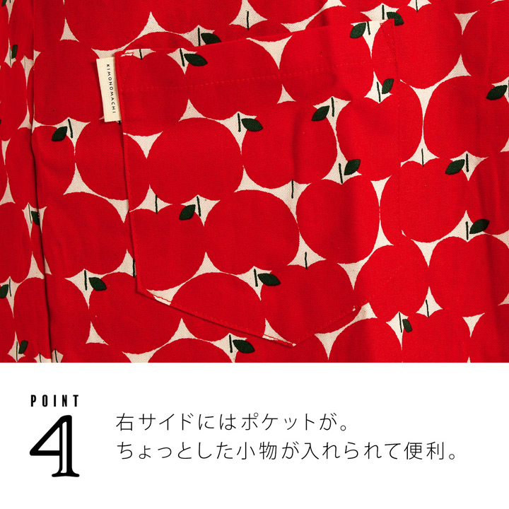 オフホワイトの地に、深緑のヘタのついた赤いリンゴのドットが並ぶ、レトロでかわいらしいデザインです。