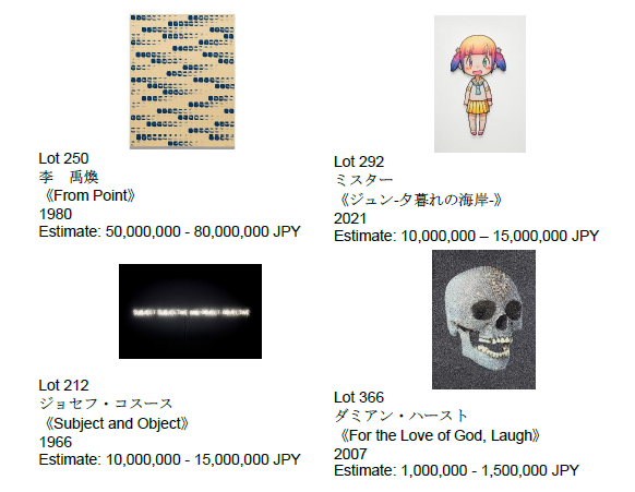 「Modern and Contemporary Art」セールでは、トップロットとして李禹煥の《From Point》(1980年)が出品され、落札予想価格は5,000万円~8,000万円となっています。また、福岡アジア美術館で11年ぶりの個展「Mr.の個展:いつかある晴れた日に、きっとまた会えるでしょう。」の開催を控えるミスターの《ジュン-夕暮れの海岸-》(2021年)、国内のアート市場での流通が希少で当社初出品となるジョセフ・コス―スのネオン作品《Subject and Object》(1966年)、ソウルの国立現代美術館(MMCA)で大規模個展が開催中のダミアン・ハーストによる《For the Love of God, Laugh》(2007年)など、現在の国内外のアートシーンと接続する作品が出品予定です。