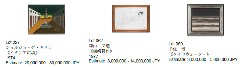 一方、「A Passage from the Important Japanese Collection」セールでは、加山又造の《裸婦習作》(1977年)、千住博の《タイドウォーター》、ジョルジョ・デ・キリコの《イタリア広場》(1974年)などが出品予定です。日本画、現代美術、形而上絵画といった多様な文脈を横断しながら、一人のコレクターの蒐集の観点を通じて構成されたラインアップとなっています。