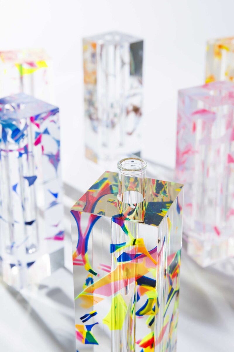 コロナ禍で使用されたアクリルパーテーションをはじめ、さまざまな廃材・端材を活用し、アクセサリー、プロダクト、アート作品、空間演出へと展開しています。