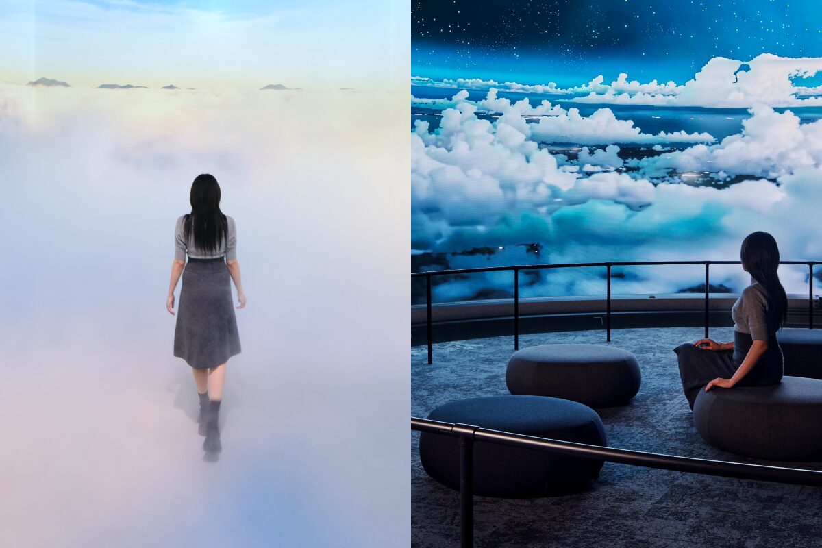 本作では、天井高約8mの空間を囲む4K映像が前後左右から足元にまで広がり、視界一面が空に包まれるような没入感を創出します。さらに、12.2チャンネルの立体音響システムや霧・風の演出効果を取り入れることで*、雲に包み込まれるような感覚を立ち上げます。朝霧の水面から夕焼けの空へ、マクロな雲の世界からミクロな氷晶の世界へ。雲の循環を多元的に交錯させながら、自然の美しさ、繊細さ、そして力強さを体感する作品として提示します。