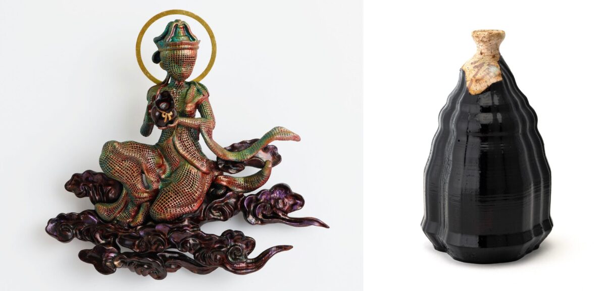 漆造形作家である北浦氏は、縄文時代から続く漆の土着的な精神性を起点に、現代のサブカルチャーを鮮やかに融合させる気鋭の作家です。制作の核にあるのは、目に見えない恐れを漆によって可視化し、心の平穏を求める安心感の追求。破棄された陶片を漆の力で蘇生させる「呼継」を駆使した《陶片転生》シリーズは、代表的な表現の一つです。仏像に漆が施されてきた歴史的文脈を参照しつつ、現代の異世界転生における神的存在を仏像的な形式として再構成し、アニメ的な意匠と仏教の浄土観を重ね合わせた《異世界雲中菩薩》など、伝統素材を通じて現代的な救済と再生の物語を紡ぎ出します。本展では、これらの代表作に加え新作も公開予定。漆という素材から立ち上がる強い存在感と、救済の造形をぜひご堪能ください。