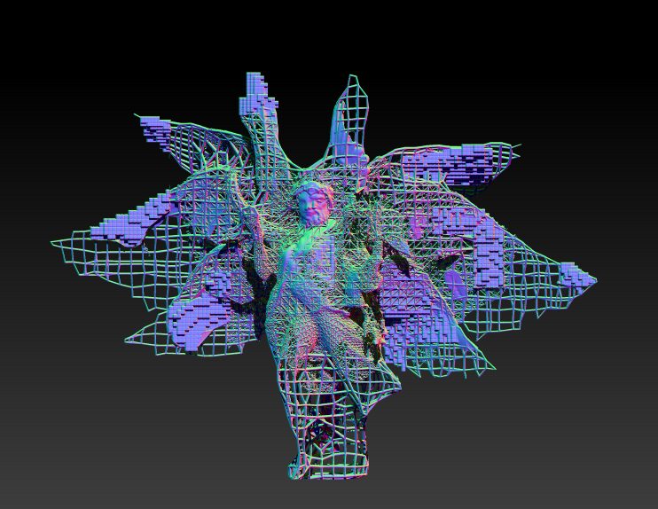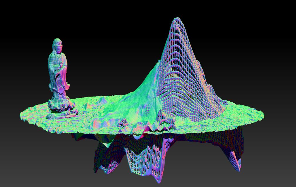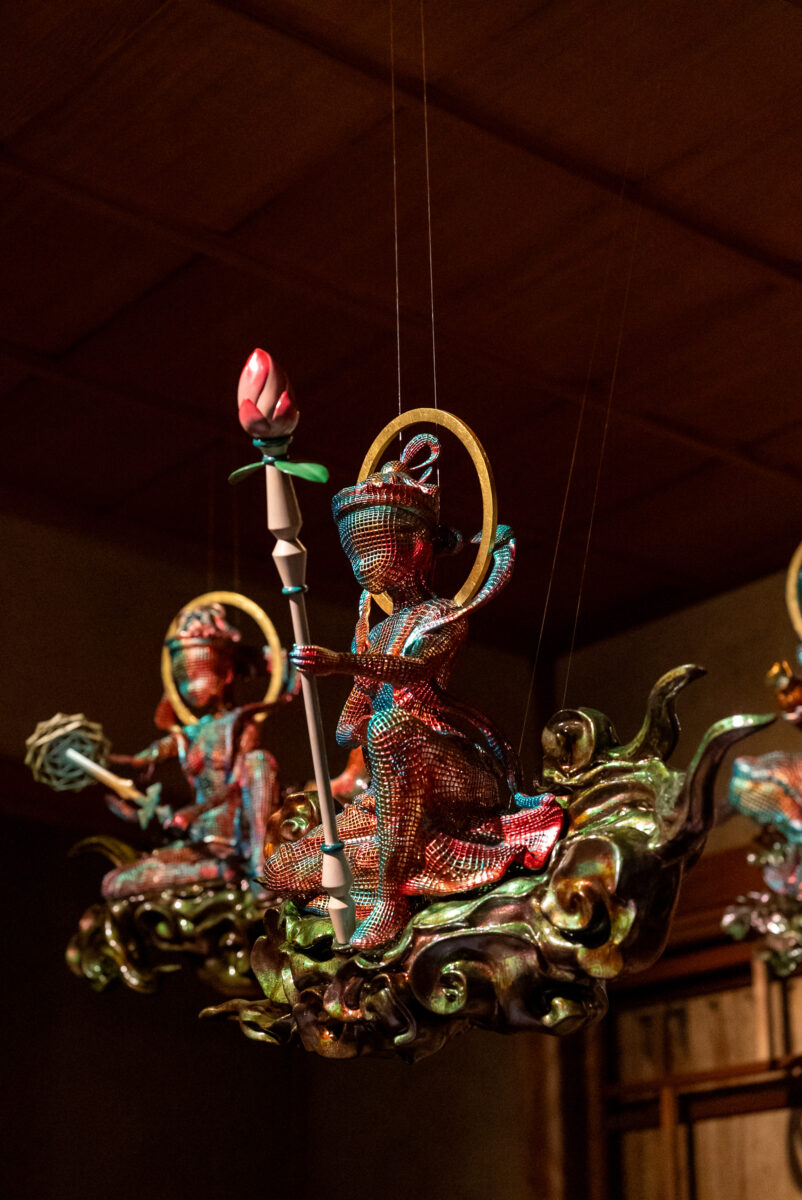 また本展は、「⽣成中」という状態そのものを含んだ展⽰として構成している。漆によるレンダリングは、かたちを最終的に定着させると同時に時間の層を重ね、その過程を可視化する。物語のように⾒えるかたちが、いまだ⽣成の途中にあるというズレを通して、現代における救済と信仰のあり⽅を問いかける。