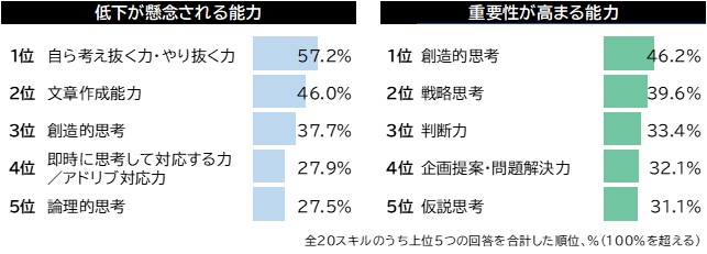 特に、「創造的思考」は、重要性が高まる能力の1位、低下が懸念する能力の3位と双方の上位を占めており、AI普及により、価値が高まっている能力となっています。