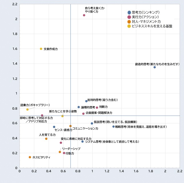 21のビジネススキルについて、縦軸に低下が懸念される能力、横軸に重要性がたかまる能力として、マトリクスで明示すると、「創造的思考」は、重要性の1位、低下懸念の3位、「自ら考え抜く力・やり抜く力」は低下懸念2位、「文章作成力」は低下懸念2位と、この3つが突出していることが明確になりました。