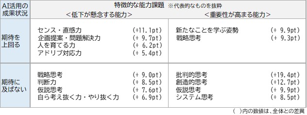 AIを活用したものの成果を感じていない企業では、低下を懸念・重要性が高まる能力ともに「仮説思考」や「批判的思考」などの『思考(シンキング)』関連の項目が多く挙げられています。これは、AIの回答をそのまま利用、うまく活用しきれず、AIを使いこなすための「問う力」「解釈」「調整」する力の不足を課題視していると推察されます。