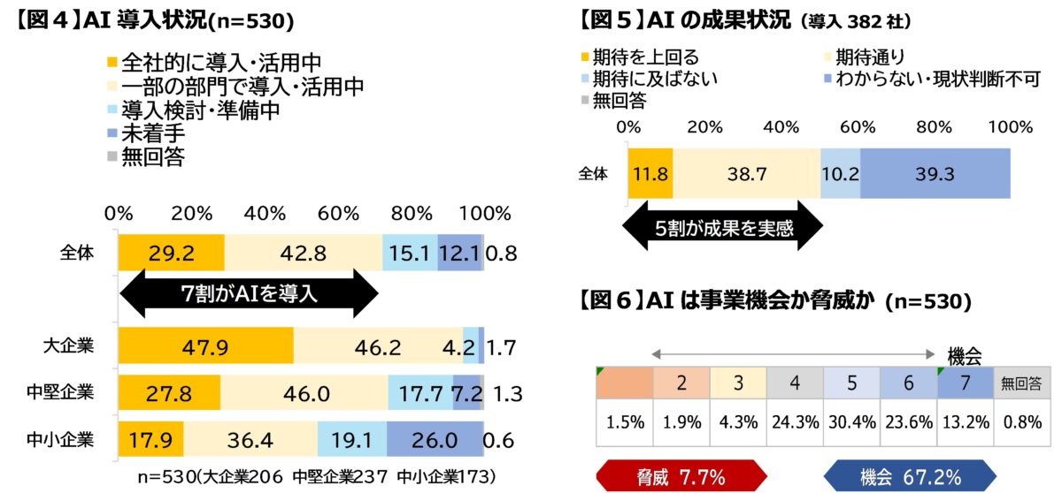 AIの導入・活用状況では、「全社的に導入・活用中」が29.2%、「一部の部門での導入・活用中」が42.8%で、7割超の企業が導入済で、従業員規模と導入率は比例傾向がみられます。AI活用の成果については、「期待を上回る」11.8%、「期待どおり」38.7%、で5割の企業が成果を実感しています。AIは事業機会となるか、脅威となるかの認識では、67.2%が事業機会とし手捉えており、脅威は7.7%となっています。