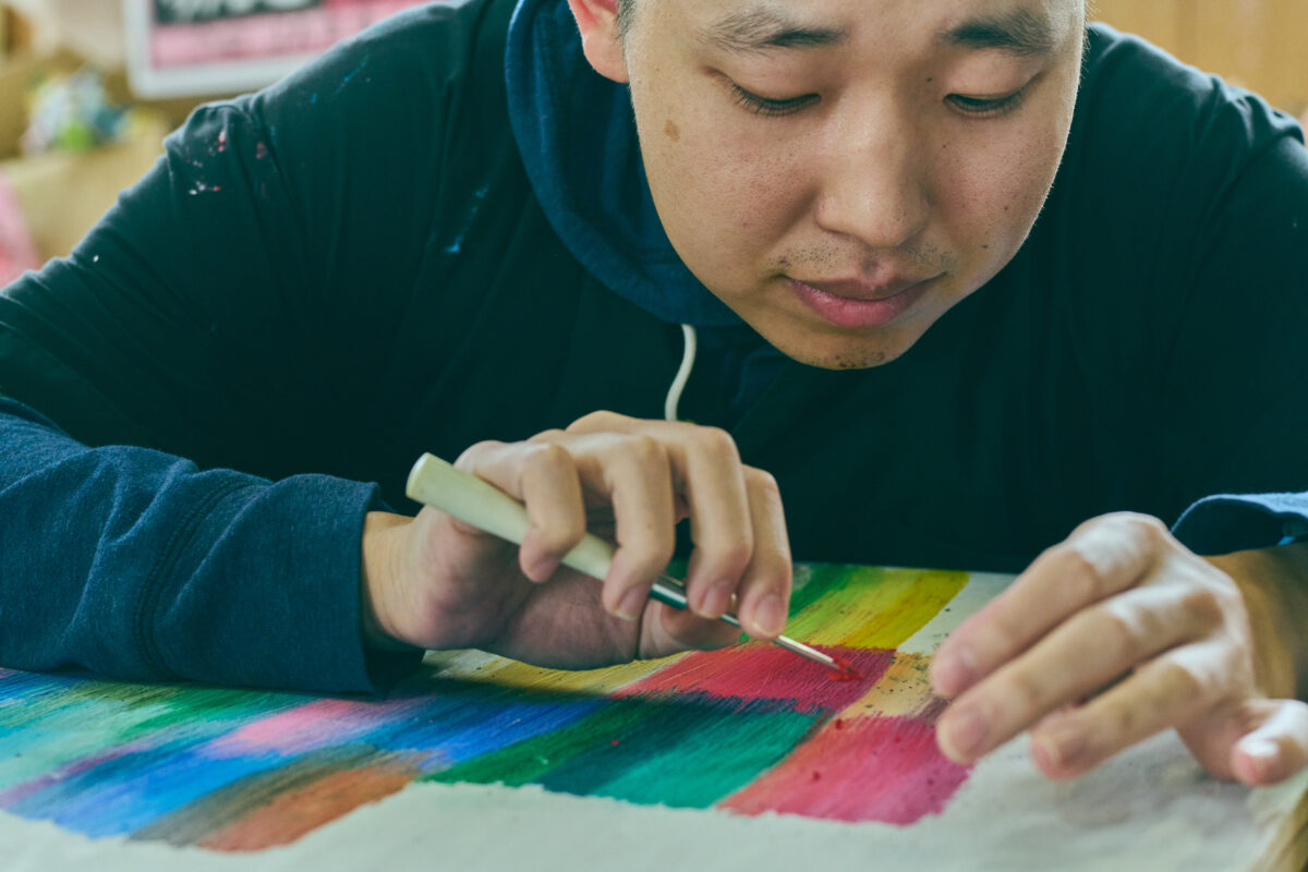 ヘラルボニー契約作家の岡部志士氏。今回の展示空間の見所のひとつとして、アトリエが再現されている。
