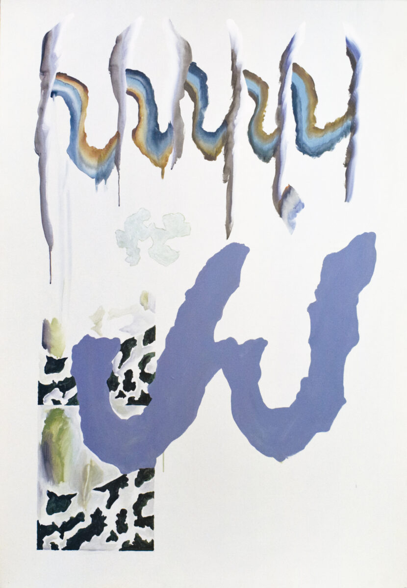 内田はこれまで、画面に現れる色や形が特定の何かを想起させてしまうことや、大きな意味に回収されてしまうことに対する葛藤を抱えながら制作を続けてきました。近年では、そうしたイメージや感覚と協働するような姿勢へと変化し、偶然に生まれる要素を受け入れながら制作を展開しています。筆致はこれまで以上に前面に現れ、記号的なかたちの表れ方にも広がりが見られます。
