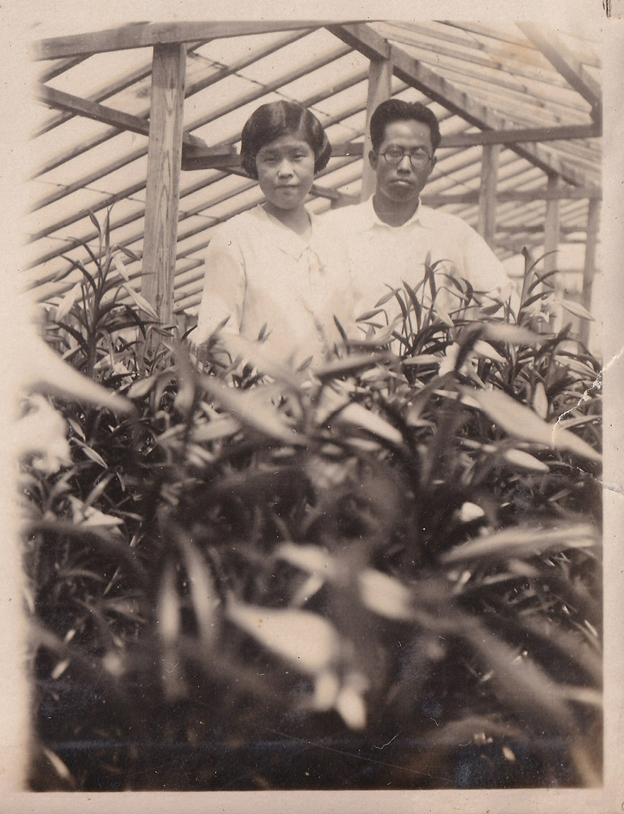 《百日草の庭》リサーチ・プロジェクト資料:アルゼンチンの百合栽培施設内で撮影された藤岡鉄太郎と妹・房江の写真 1930年代頃 個人蔵
