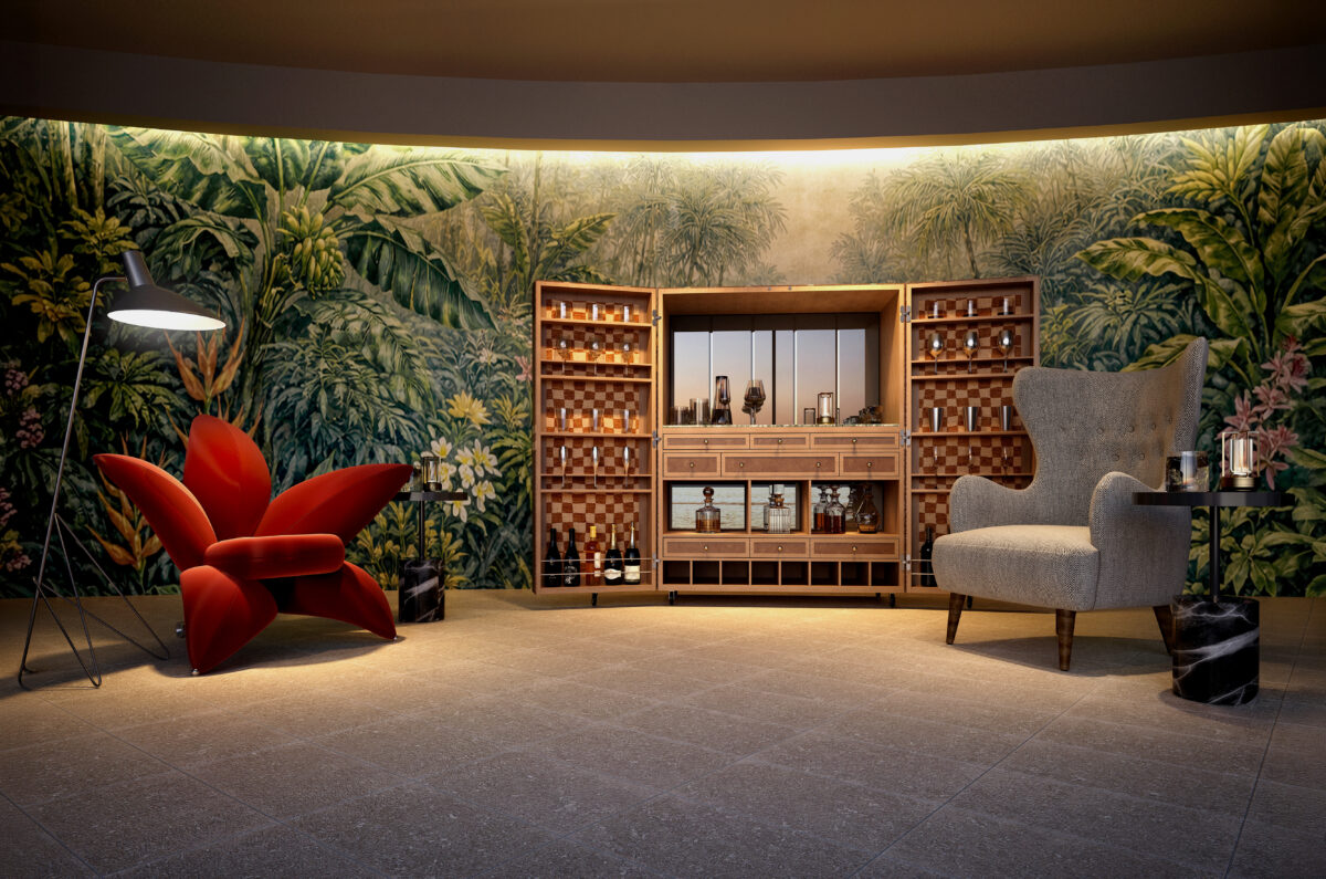 「トランクバー」が誘う、大人の休息:「旅」を象徴するトランク。かつてサファリなどの旅先で、人々が午後のカクテルを愉しむために集った「トランクバー」の文化を、本施設に再現しました。このバーラウンジでの時間をより特別なものにするため、グラスやカクテル類など、LEONとUMITOがセレクトしたこだわりのアイテムや演出を随所に取り入れる予定です。