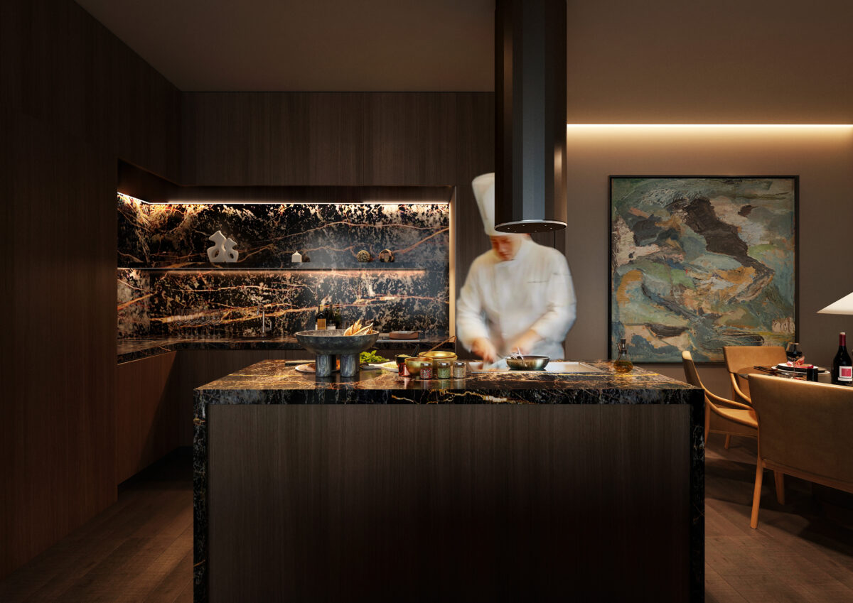 リビングの主役は、大人数でもゆったりと食事を楽しめるダイニングテーブル。独立したアイランドキッチンには鉄板も備え付けられており、出張シェフを招けば、そこは一夜限りの最上級レストランへと変貌します。