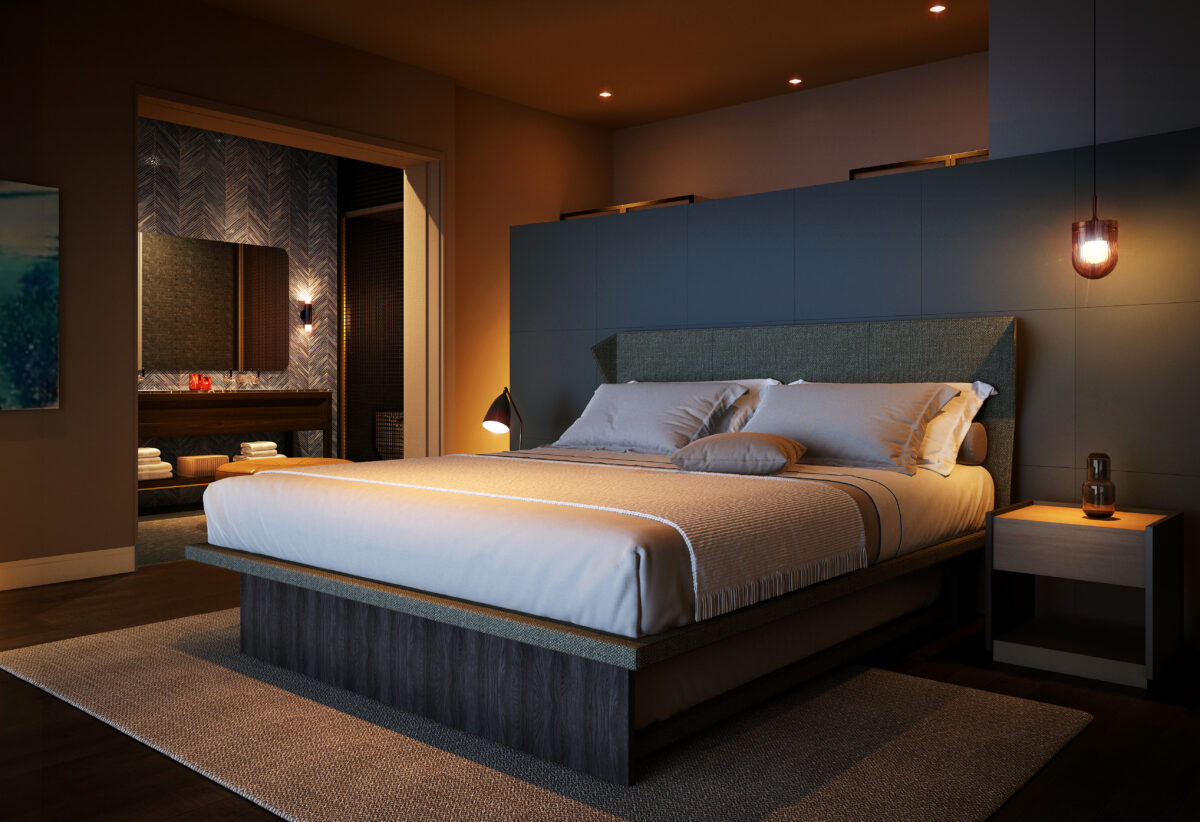 マスターベッドルームにはキングサイズのベッドを備え、上品で落ち着いたトーンの空間に仕上げています。