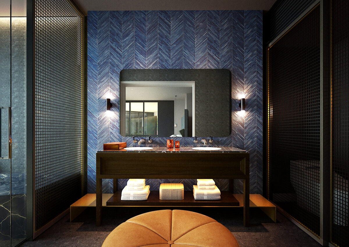 上質なスーツのディテールを彷彿とさせるヘリンボーン柄の壁面や、職人の手仕事を感じさせるモザイクタイル。
