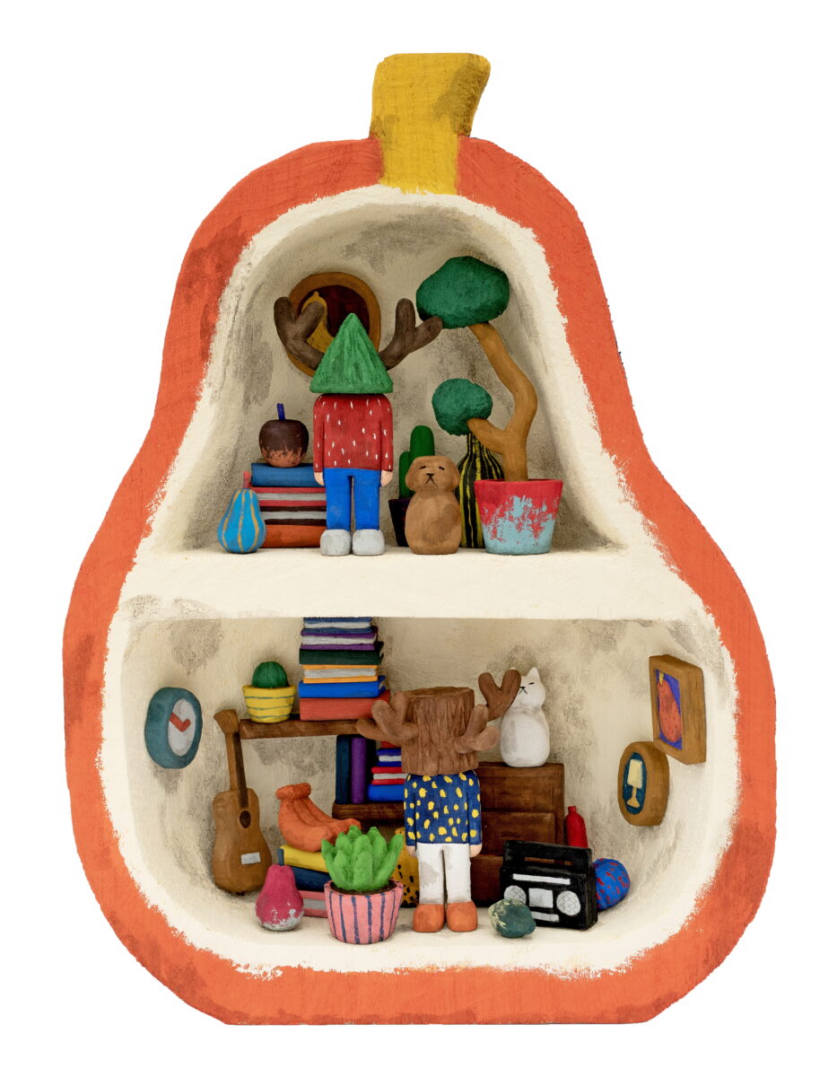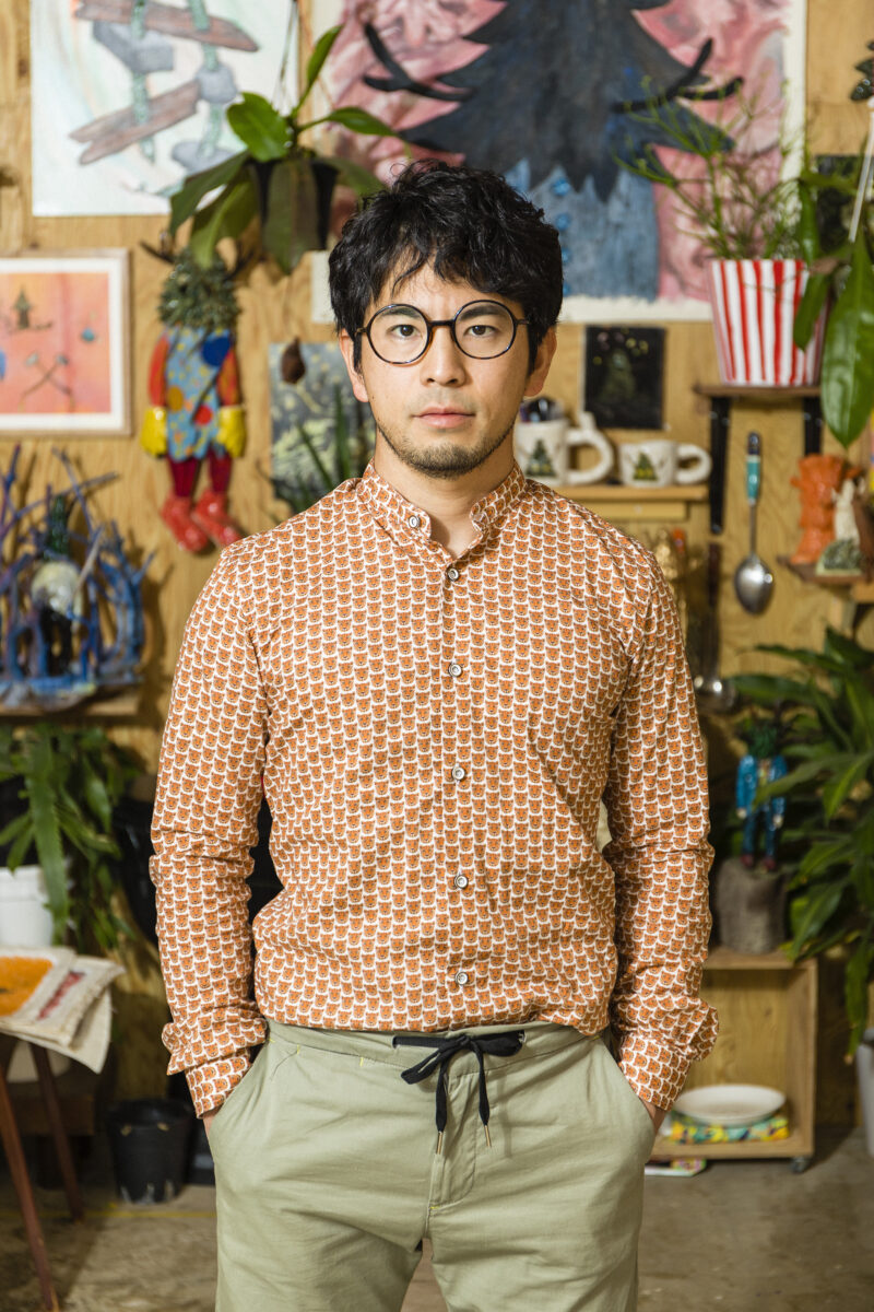 その作品にしばしば現れる、人のような身体に植物の頭部を持つモチーフは、作家が幼少時に岡山の豊かな自然の中で育った経験が原型として存在しています。また、高校卒業後に渡ったロンドンで、街路樹や公園など人の手で整備された植物を「自然」と呼ぶことに抱いた違和感をきっかけに、作品を通じて現代社会における自然と人間の境界線を追求していくこととなります。