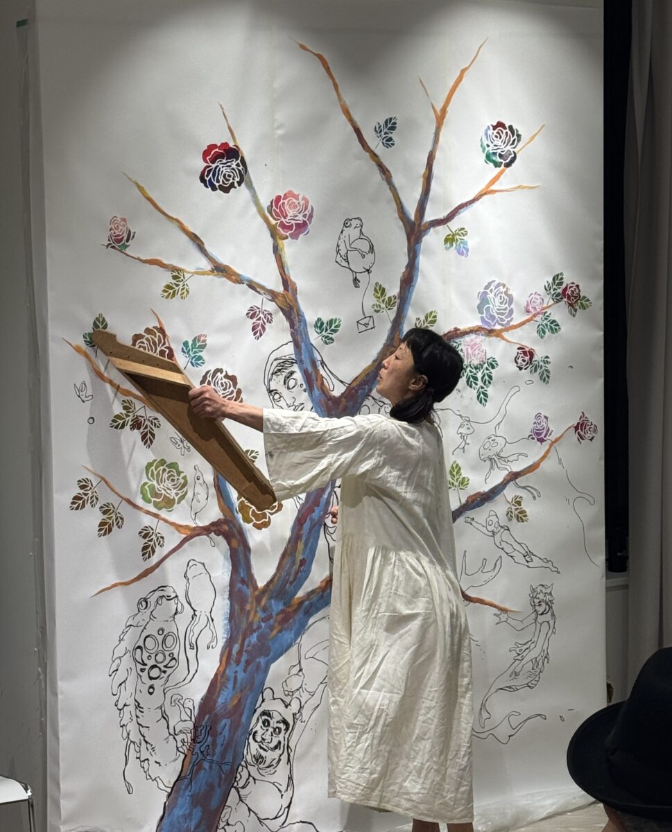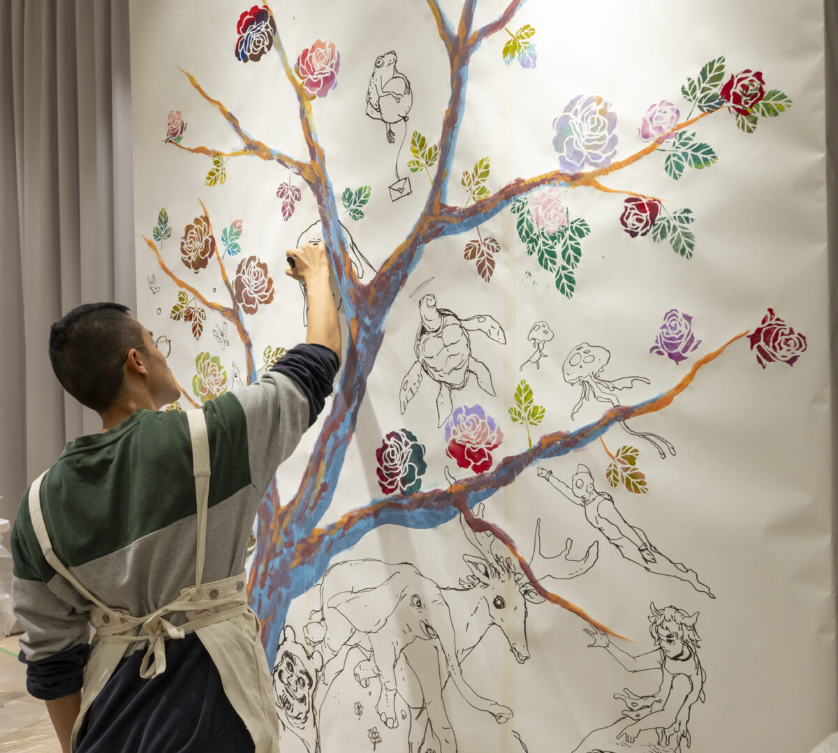 イベントにはプロジェクトに興味を持つ来場者約100人が集まりました。トークイベント前には、漫画家のおぐりちはやさんのライブペイントが行われました。おぐりさんは「ワイルドローズ」の木や幹を描き、貝印社員や参加者がステンシルの手法で花を咲かせました。この「ワイルドローズ」は、2017年におぐりさんがラダックの公立学校で生徒たちと完成させた壁画で、9年ぶりの修復を予定しています。また、同じ壁面には次々と不思議な生き物が遊泳するように描かれ、ラダックの芸術祭の様子を彷彿させました。インドのスパイスを効かせたチャイやラダックの伝統食の春雨カレー「ピン」を楽しみながらの鑑賞となりました。