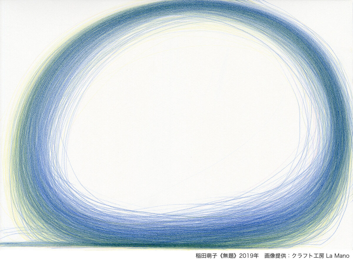 1985年、京都府生まれ。2003年より、クラフト工房 La Mano(東京都町田市)に所属。色鉛筆のこすれる音や感触を楽しむように、時に童謡を口ずさみながら、ゆったりとしたリズムに身を任せるようにして円や線を描く。その時々の好きな動きをもとにした、稲田の感覚的な心地よさによって生まれる作品は、まるで繭のような柔らかさと光をたたえている。