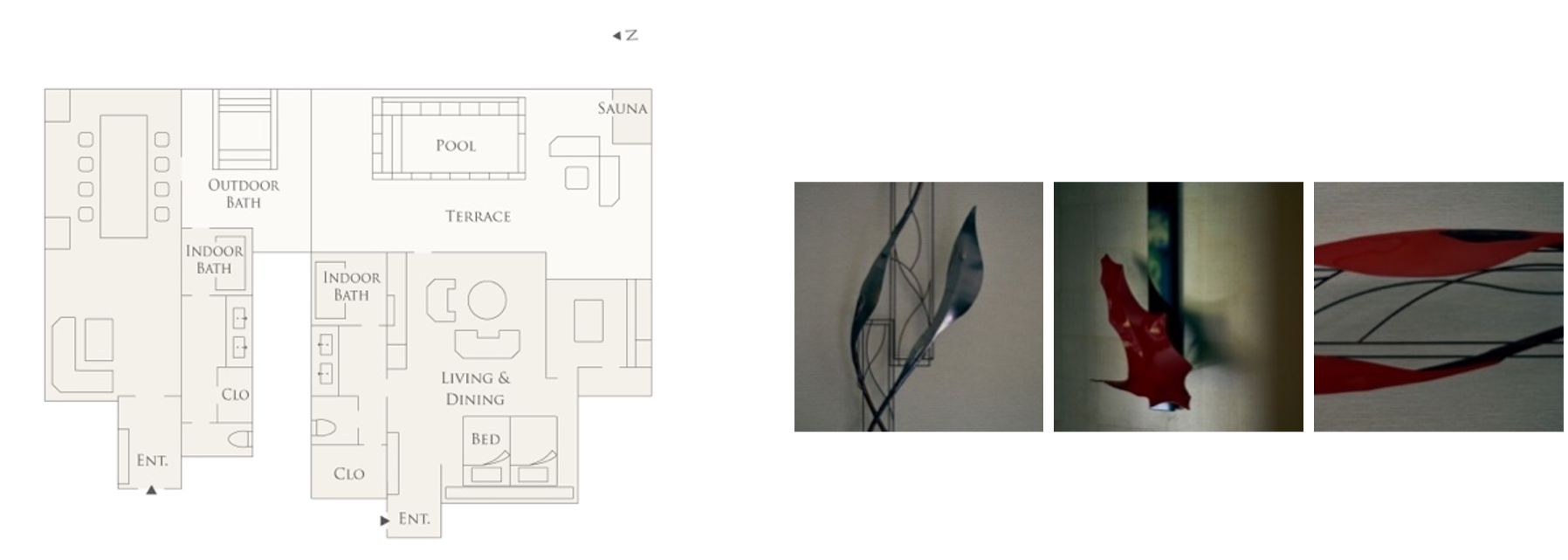 スペイン語で「空間」や「宇宙」を意味するエスパシオは、神秘的な旅、癒やし、安らぎ、そして喜びに満ちた場所を提供いたします。9棟の客室は、「麒麟」「鳳凰」「亀」「龍」を箱根四神とし、吉祥の象徴を組子、和紙、唐紙、漆、漆喰といった日本の伝統技術を手掛ける作家陣が、さまざまな視点で捉えたアートで彩られています。すべての客室がリビングダイニングやベッドルームのほかに、内風呂や露天風呂、プールを備えているほか、サウナを備えている客室がございます。