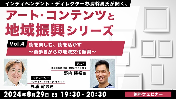 株式会社クリーク・アンド・リバー社(C&R社)は8月29日(木)、アートやコンテンツを活用した地域振興に関心がある地域企業や自治体職員の方、コンテンツクリエイター、コンテンツ企業の方などを対象に、無料のオンラインセミナー「インディペンデント・ディレクター杉浦幹男氏が聞く、アート・コンテンツと地域振興シリーズvol.4 街を楽しむ、街を活かす~街歩きからの地域文化振興~」を開催します。