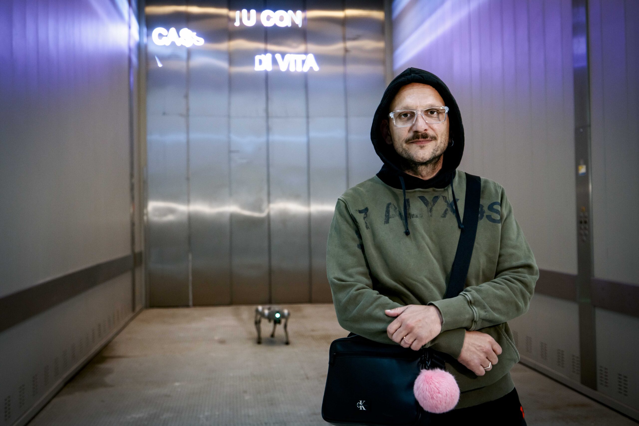 展覧会のオープニングを飾るのは、リッカルド・ベナッシによる『ASSENZAHAH ESSENZAHAH』(2024年)。MAXXIのサービスエレベーター内で、2匹のロボットの犬がアーティストによって振り付けられた動きに従い、音楽と壁に投影されたテキストビームのレーザーを伴って空間を移動する作品です。このインスタレーションは、私たちの存在そして私たちの家庭的、感情的、身体的空間を席巻する新しいテクノロジーの影響における新たなアプローチを表現しています。