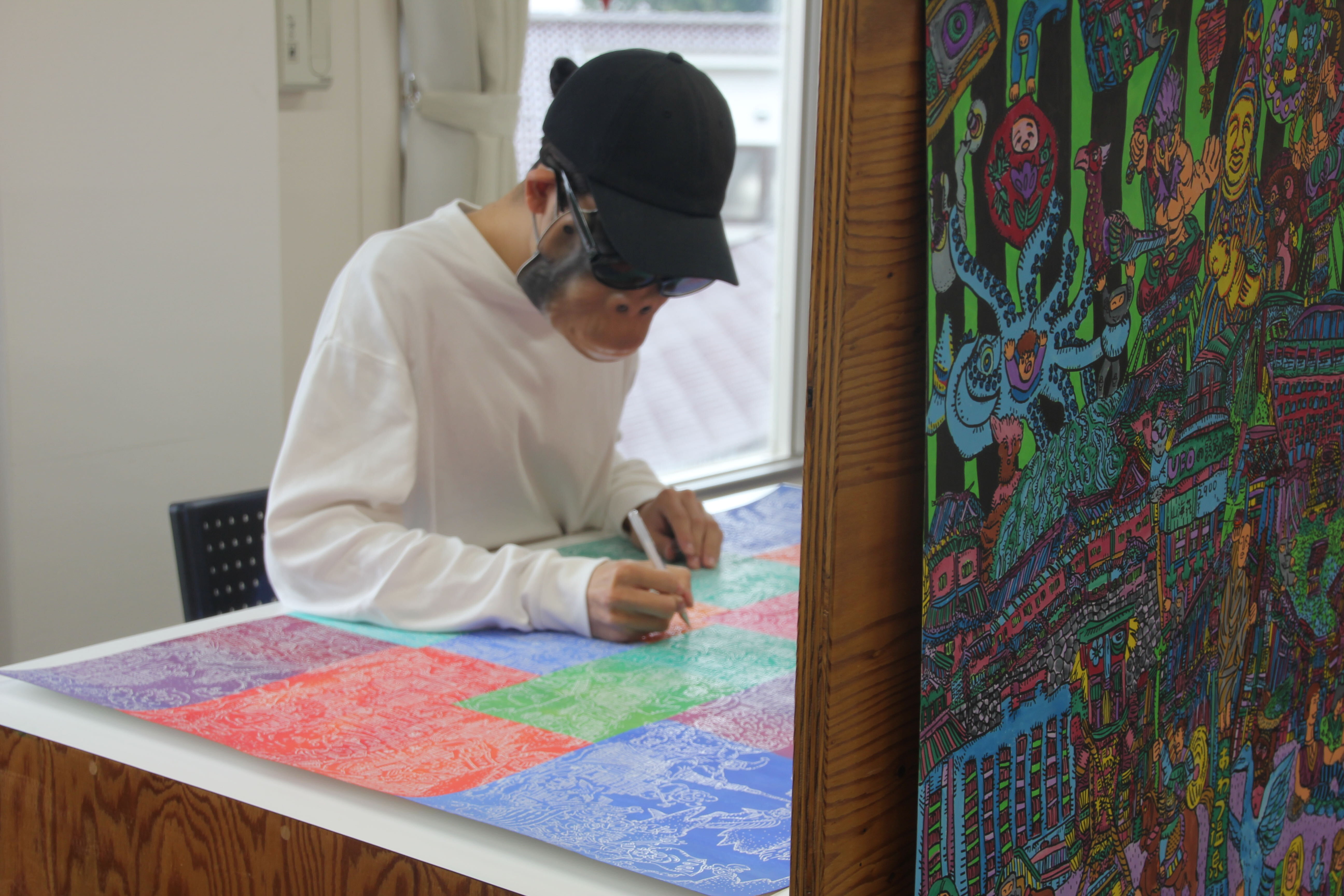 大好きなアニメやゲームキャラクターを模写することから絵を描く楽しみを持った少年期から、彼の世界観は更なる広がりを見せるようになった。細やかで緻密な線の集合体で描かれた動物や風景、妖怪やモンスターのような生き物が楽し気に生活される街並みなど、彼の頭の中のイメージそのままが絵に映し出されている。絵を描くことで人とつながりが生まれ、夢を実現させるための活力であると、彼の創作への意欲が絶えることはない。本展ではSHIBUYA SKYを体験し、キービジュアルを制作。